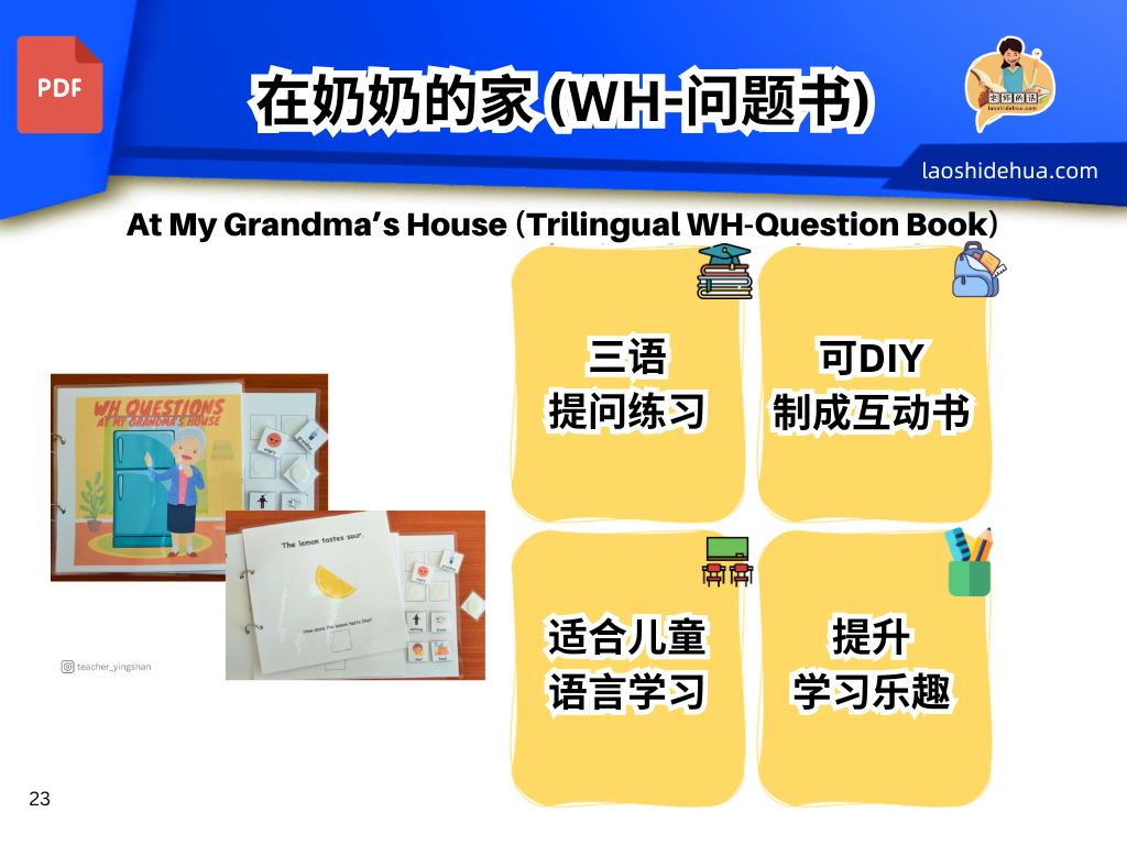 All 3 languages WH-question book is in here. It is based on the story book – At my grandma’s house (you can find it in the catalogue)
