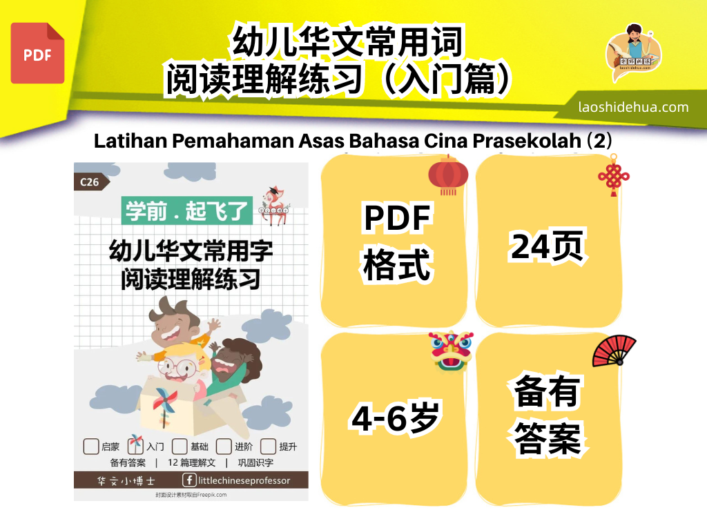 C26🎓Softcopy 🎓【学前✈️起飞了】幼儿华文常用字阅读理解练习(入门篇)【Preschool Chinese】Mandarin Common Words Reading Comprehension Exercise Level 2