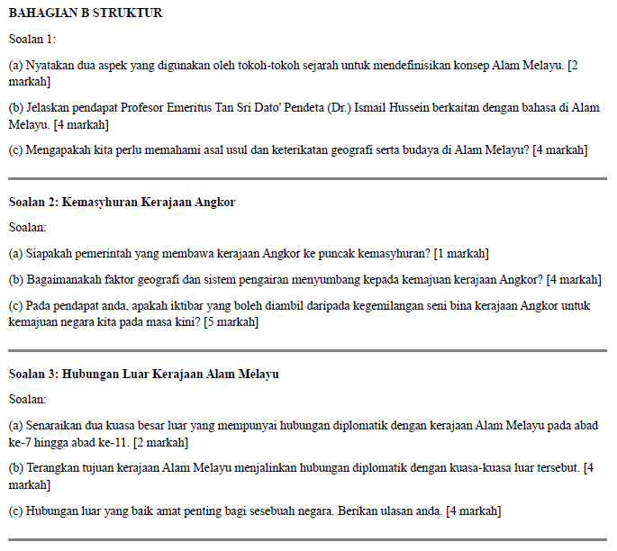 本套【Form 2 Sejarah 单元练习】特点: ✅ 纯正 BM 命题:100% 模拟 UASA 真实考卷语境,让学生适应考试遣词用字。 ✅ 紧贴课本纲要:涵盖中二所有核心章节。 ✅ KBAT 重点解析:练习包含高频 KBAT 题,并附带详细答题思路与范文,教你如何拿满分。 ✅ UASA 标准格式:涵盖 Bahagian A, B 和 C,针对性训练答题技巧。