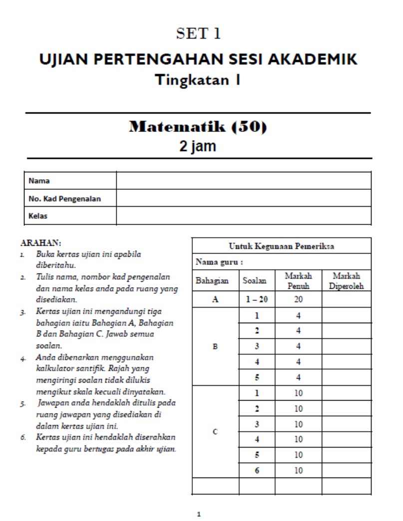 | Tingkatan 1 Matematik (Dwibahasa) UPSA Ujian Pertengahan | SET 1, SET 1-2 |