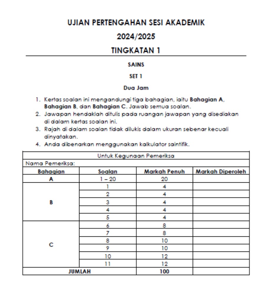 - Tingkatan 1 Sains UPSA Ujian Pertengahan Sesi Akademik ( 2 SET)