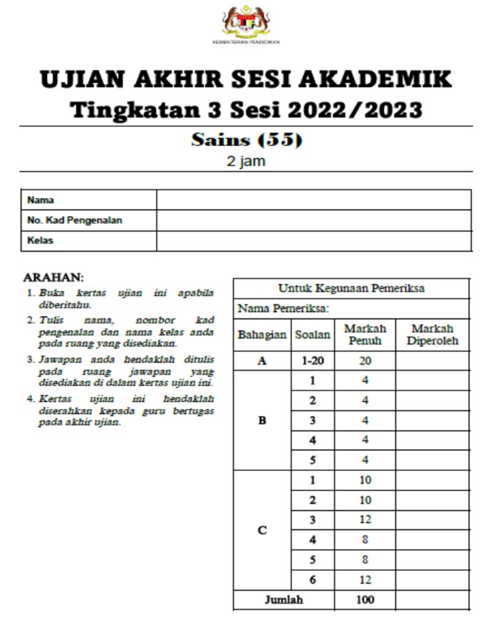 Tingkatan 3 Sains (Dwibahasa) UASA 2022/2023 (1 set)