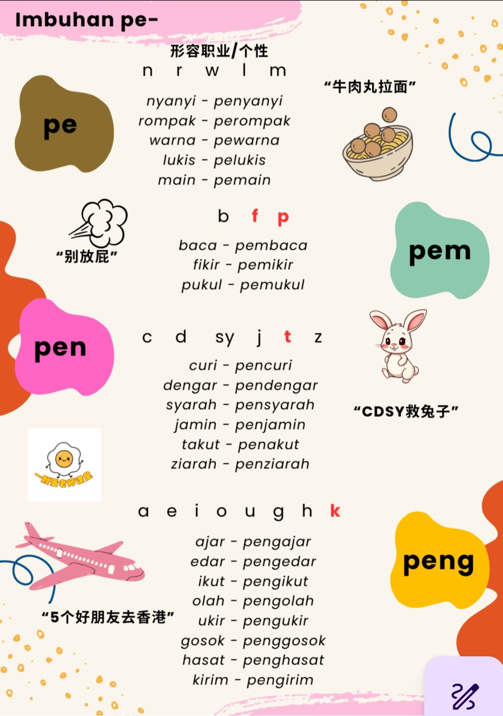 这是一本能让小朋友学好国语Imbuhan的口诀及方法! 笔记里含有前缀词,缀词及后缀词的秘诀。笔记也是使用各种有趣的插画, 小朋友会更❤上阅读!