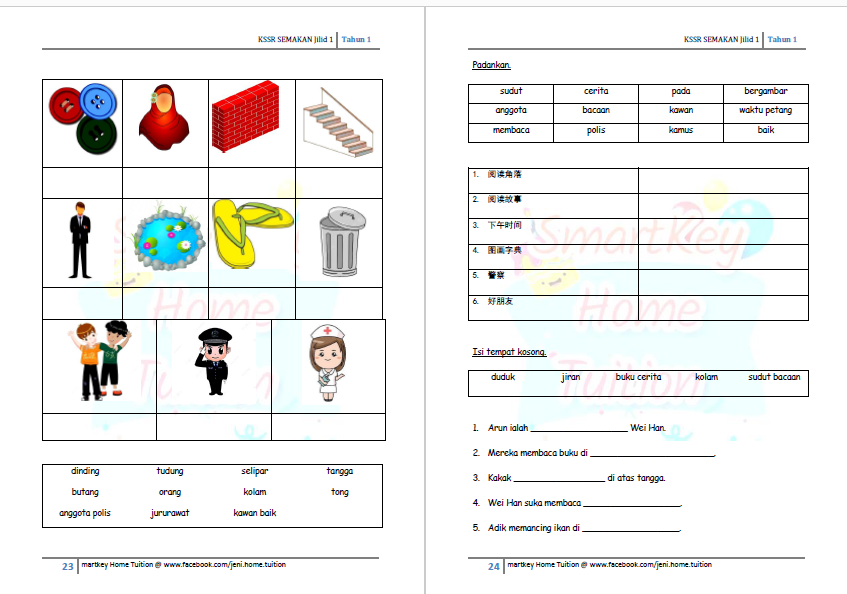 内容 Isi Kandungan:Padankan gambar, Suaikan makna, Isi tempat kosong, Tatabahasa, Susun Perkataan