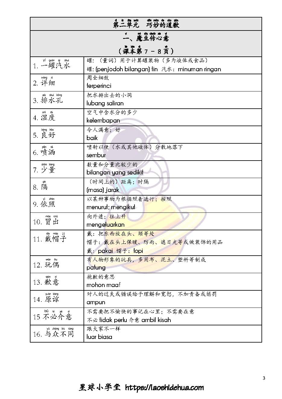 ![[三年级华文] 生字表 (拼音+中马翻译) - Image 2](https://laoshidehua.com/wp-content/uploads/2022/03/Picture1-2.png)