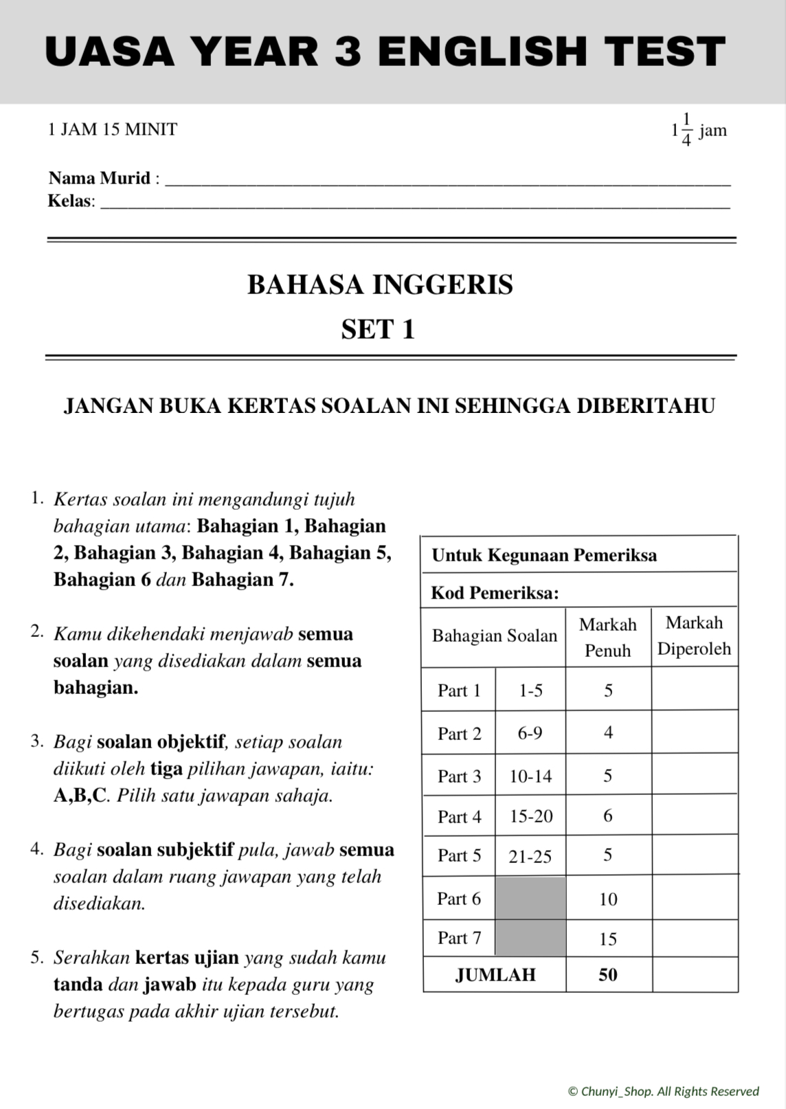 [Year 3 English] UASA ENGLISH MODEL PAPERS