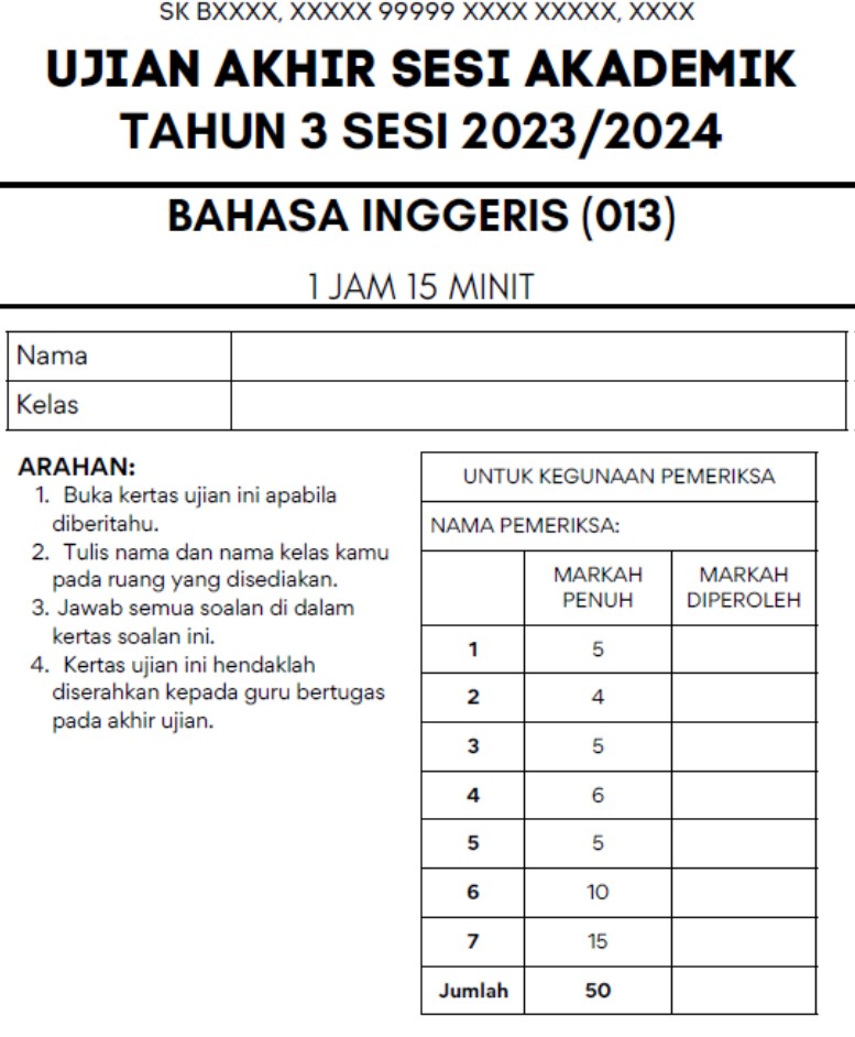 - Year 3 Paper UASA 2023/2024 (1 set)