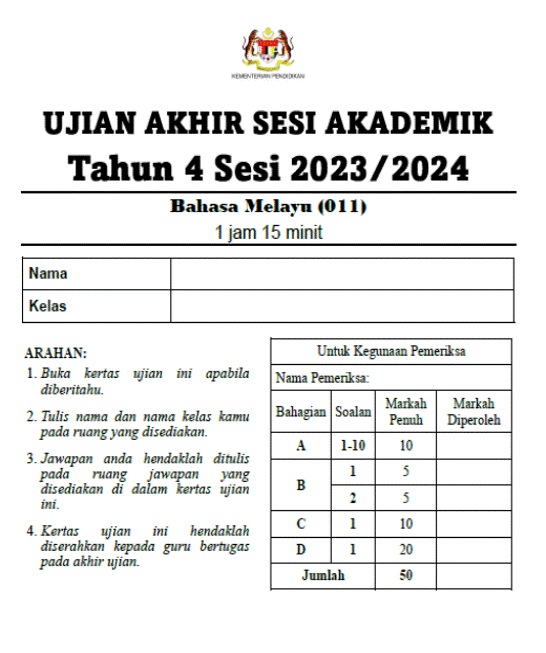 四年级马来文 模拟试卷 UASA 2023/2024 (2 set)