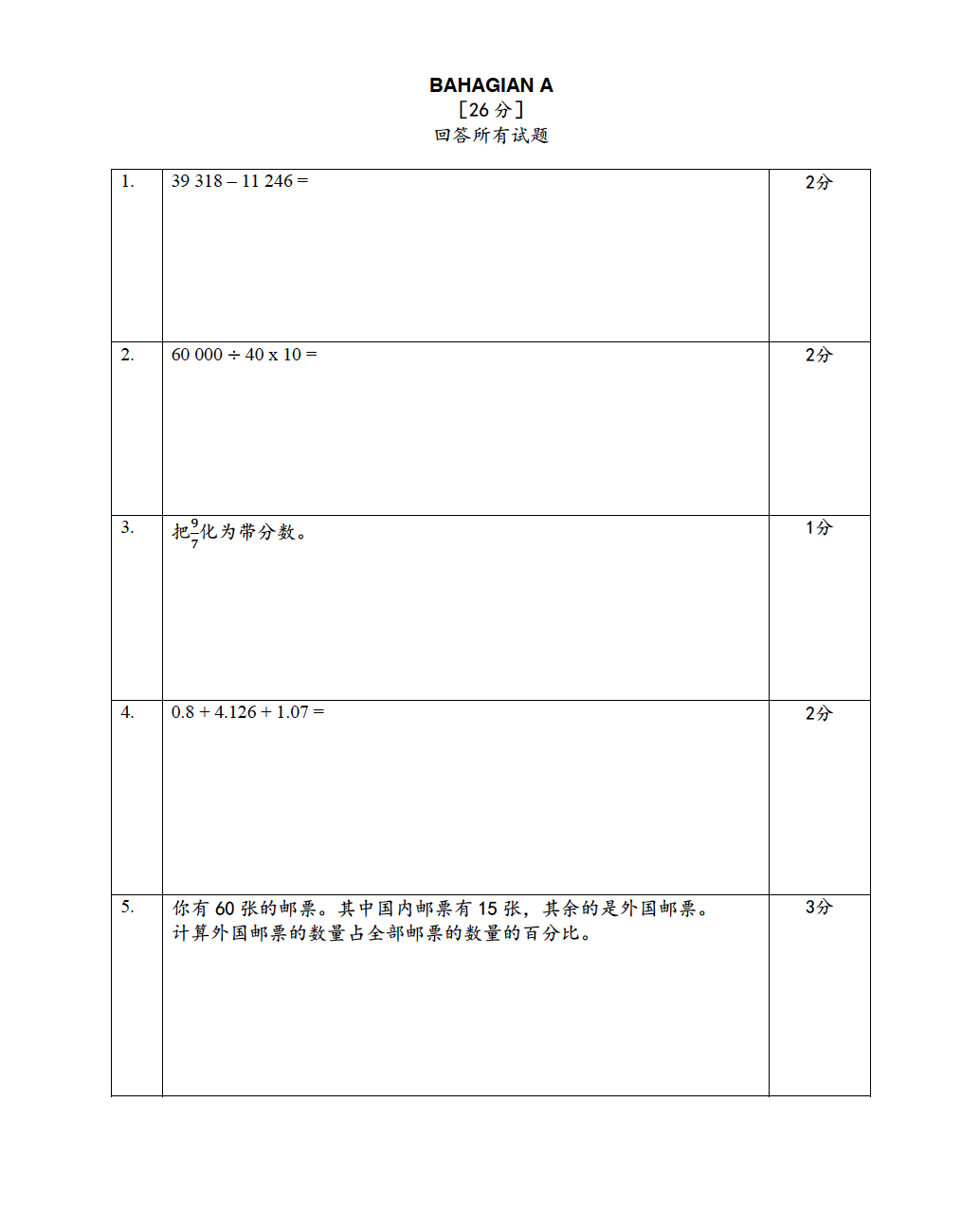 UASA 四年级试卷 (国,华,英,数,科)