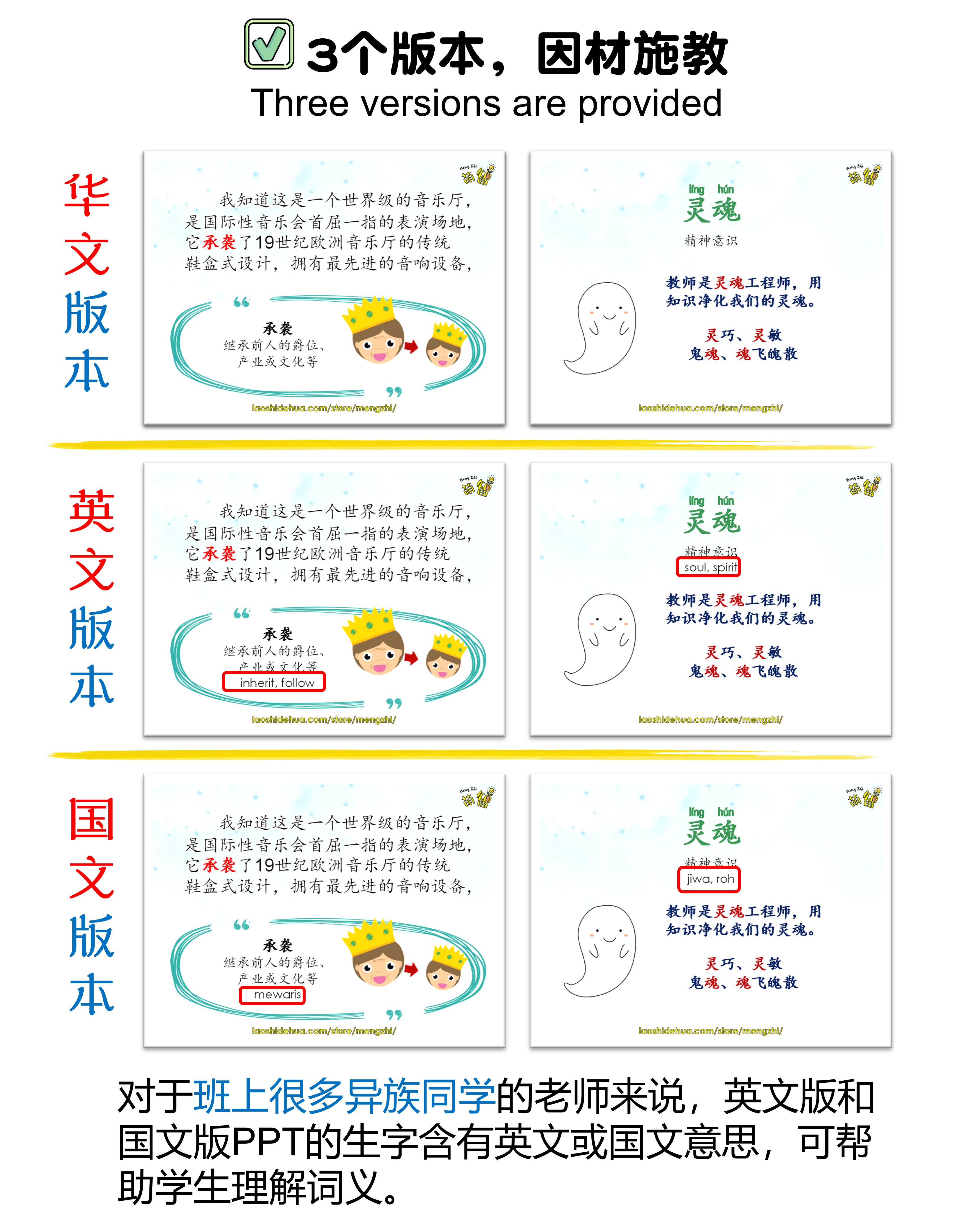 | 词语解释 Vocab explanation | 英文版(华文+英文 Chinese + English), 国文版(华文+国文 Chinese + Malay), 华文版(华文而已 Chinese Only) |