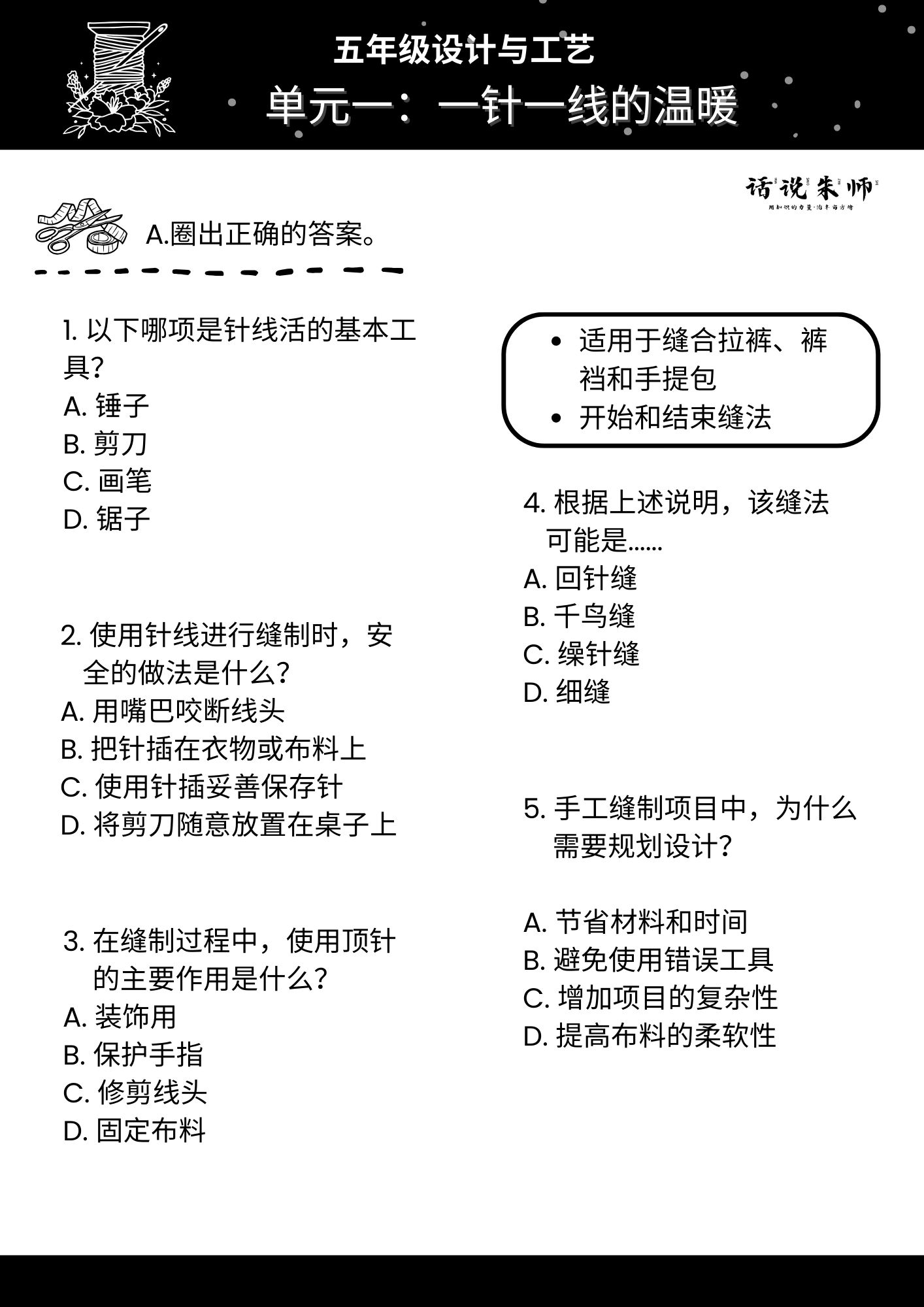 [五年级设计与工艺] 单元一 PPT+免费手缝稿图
