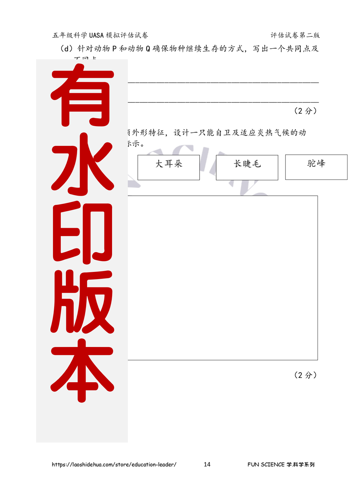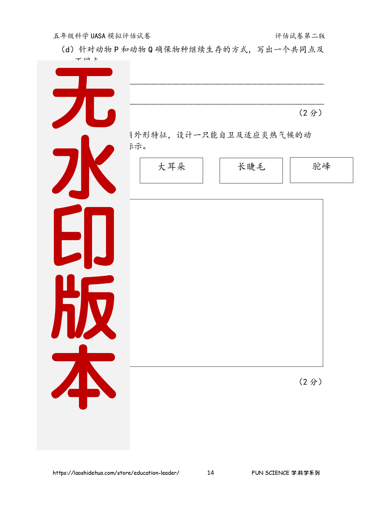 | 五年级科学UASA试卷第二版 | 无水印, 有水印, UPSA(年中一份)+ UASA(全年一份) 无水印, UPSA(年中一份)+ UASA(全年一份) 有水印 |