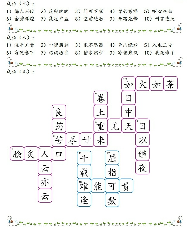 一共有10个成语练习,每一个练习有10道练习题,除了练习九和十,有12道题。