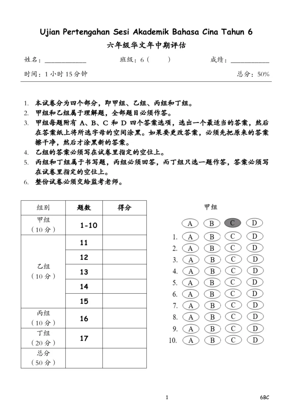 *华文没有固定的格式(年中评估试卷分数为50%或100%)