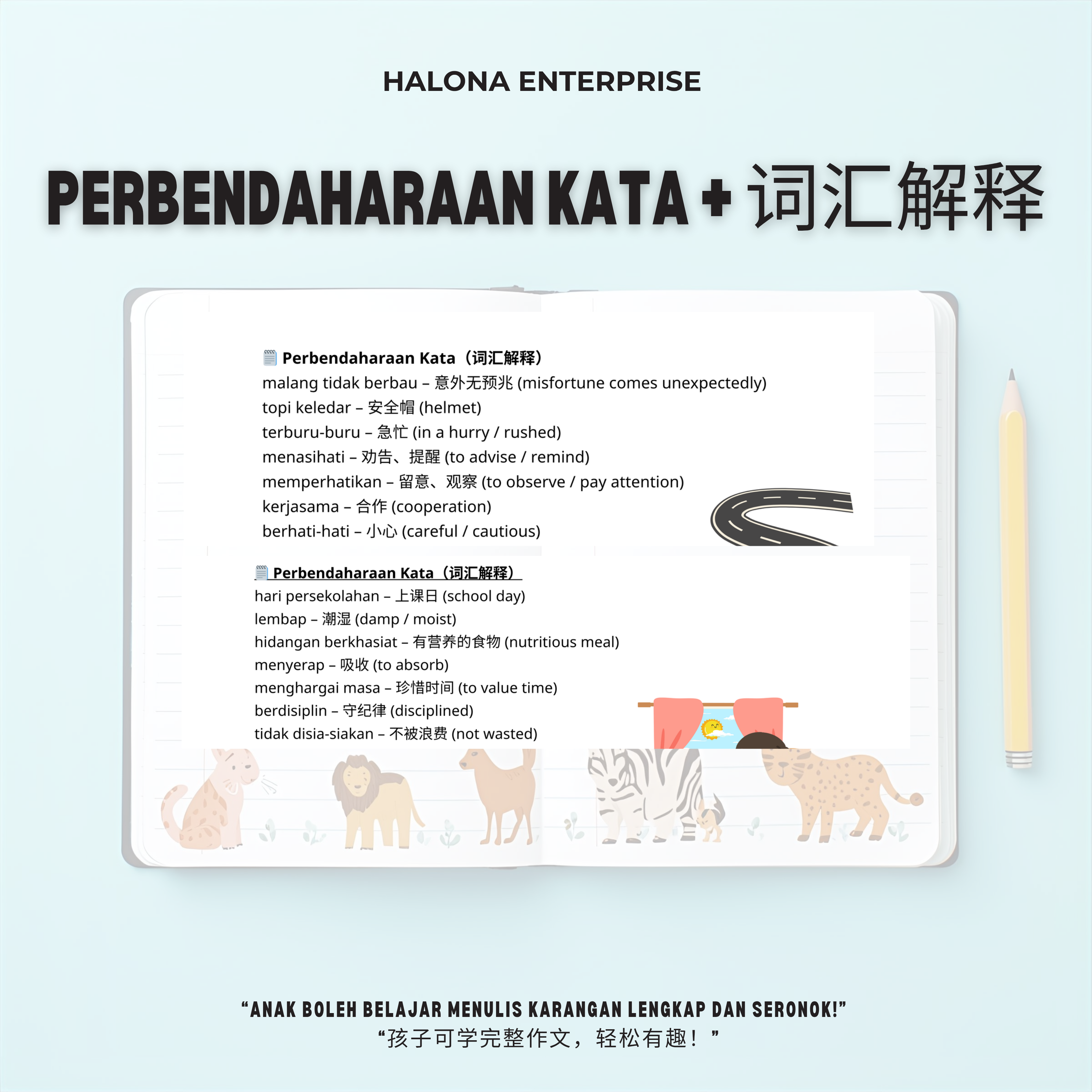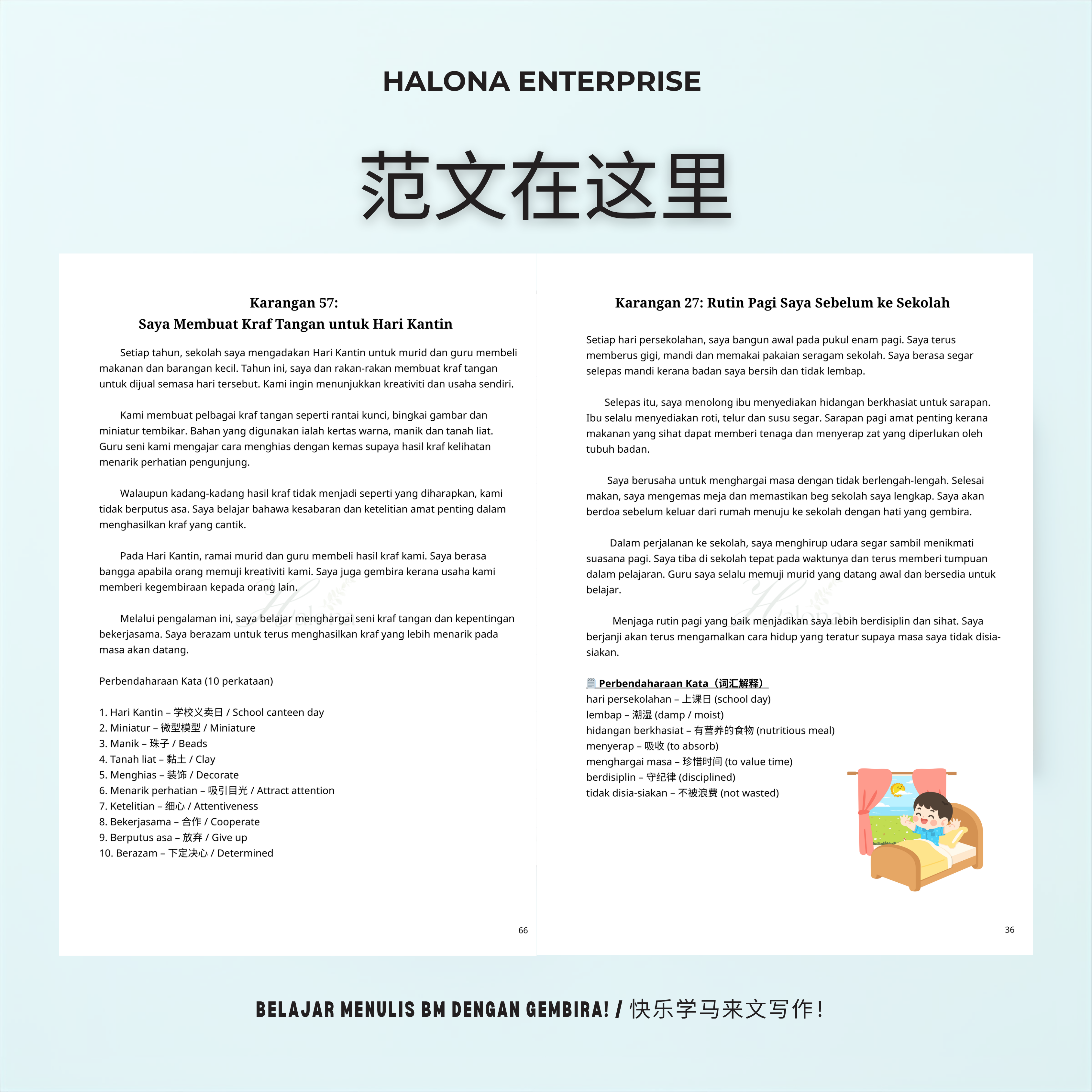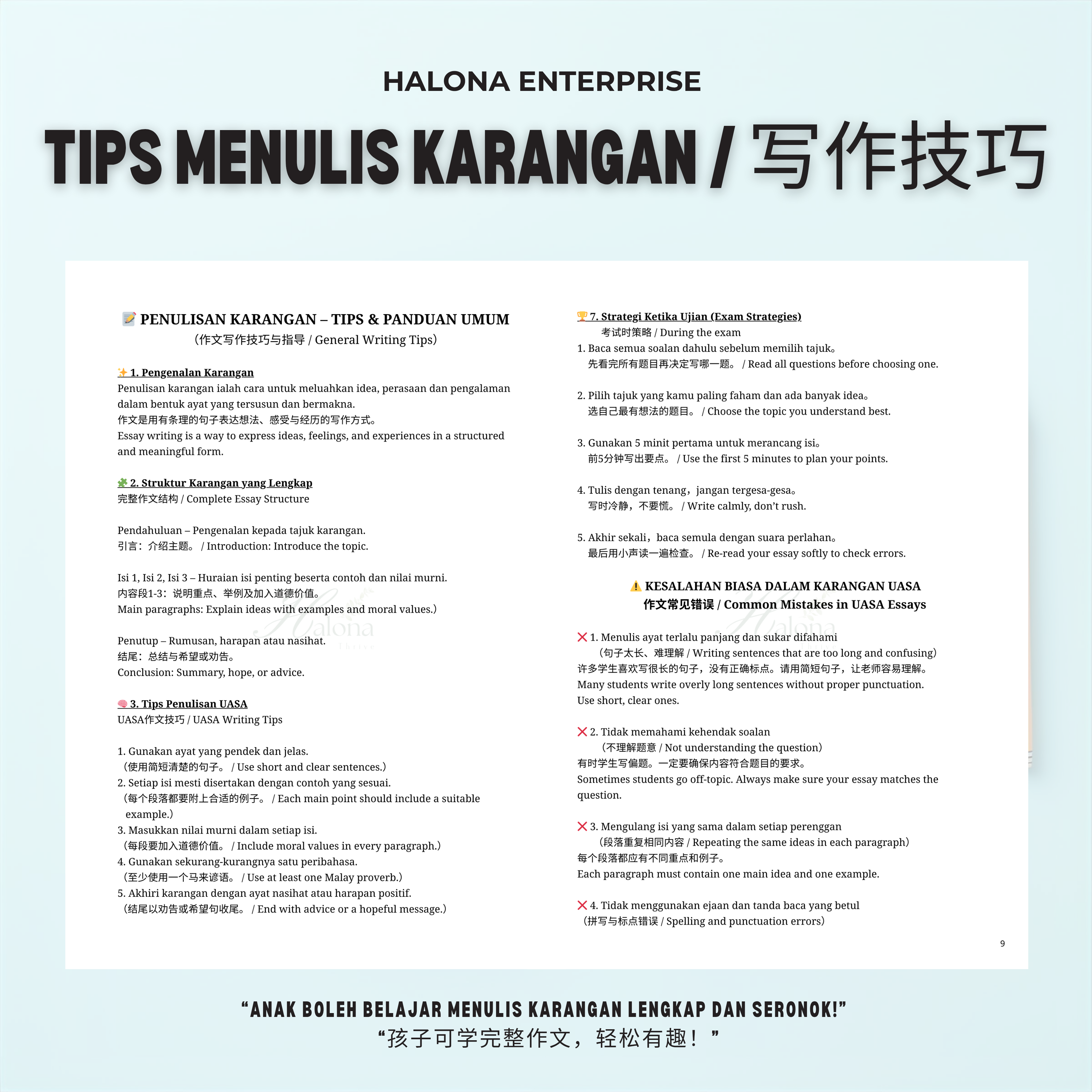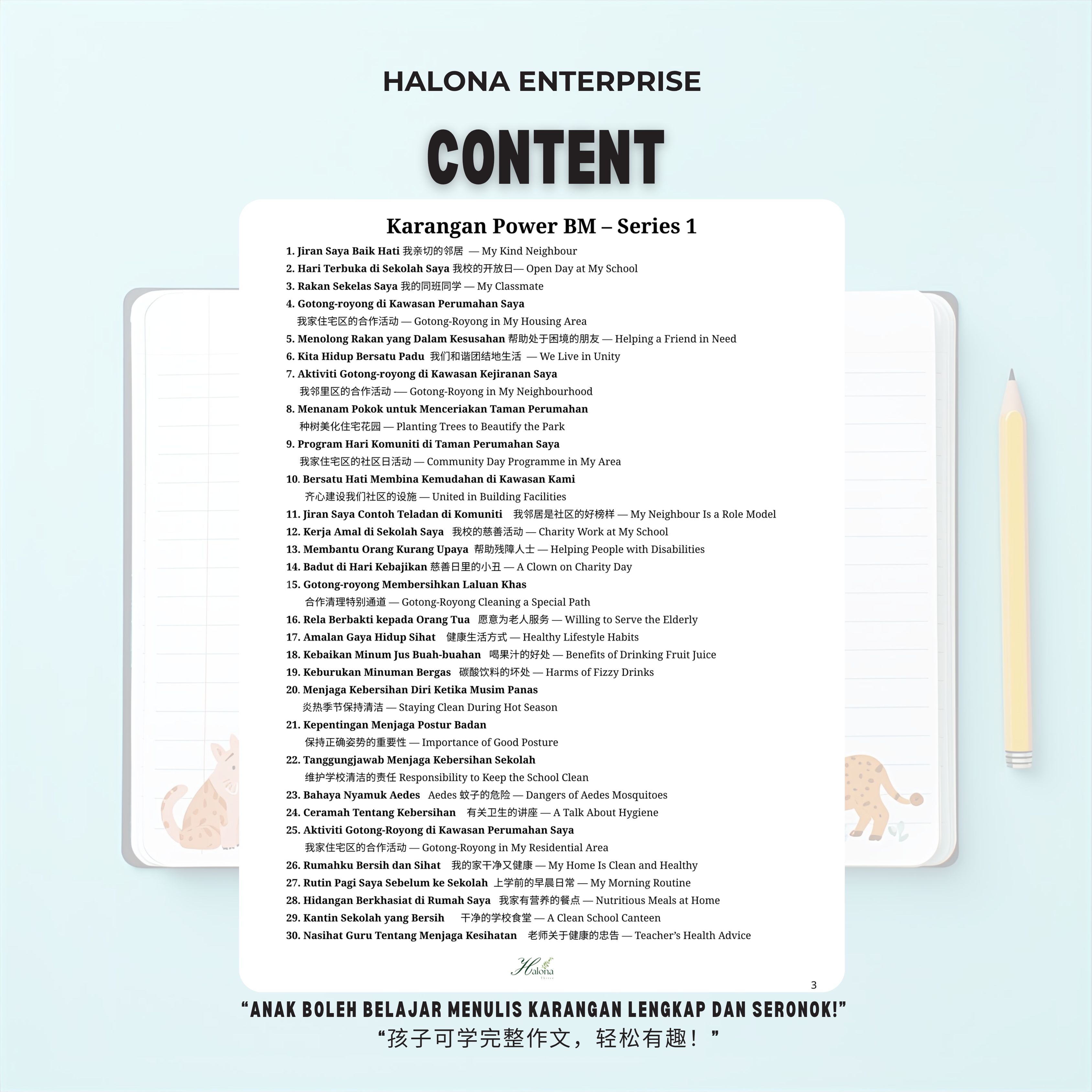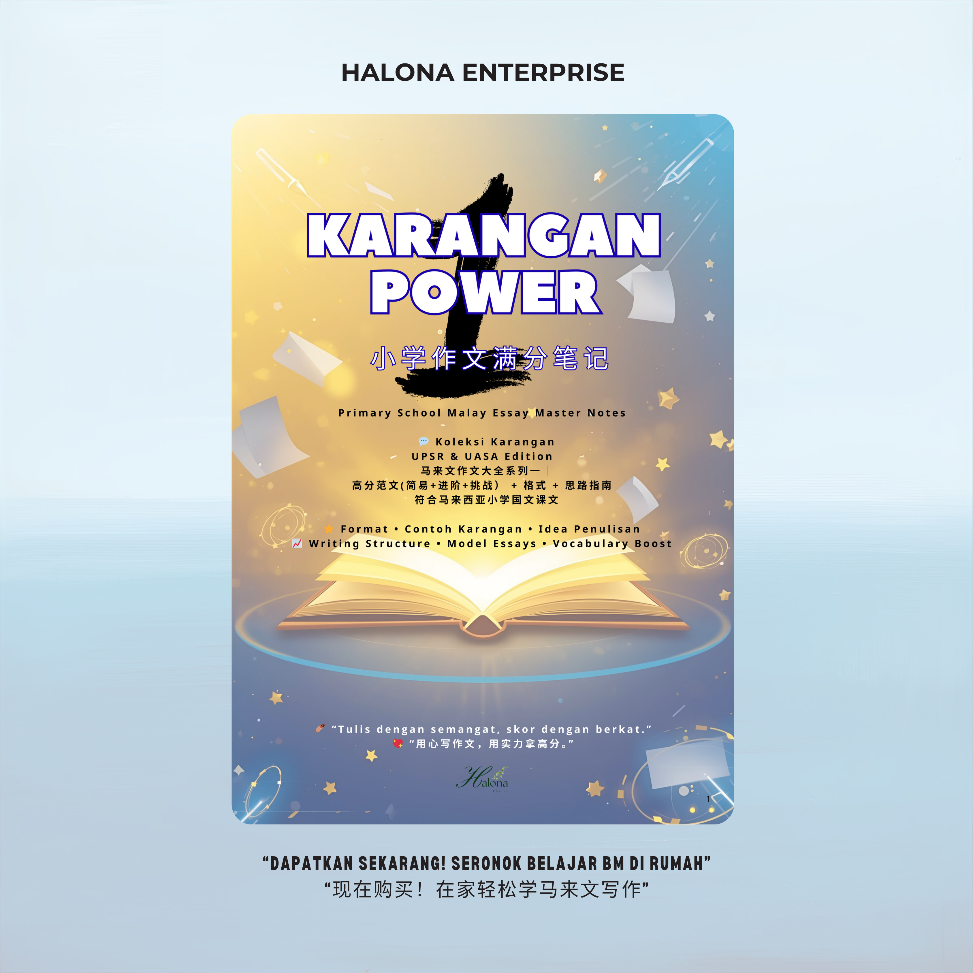 Karangan Power BM 提供 60 篇原创、五段式作文,配合课本词汇、语法与考试技巧,让孩子在家也能系统训练写作能力,轻松应对考试!