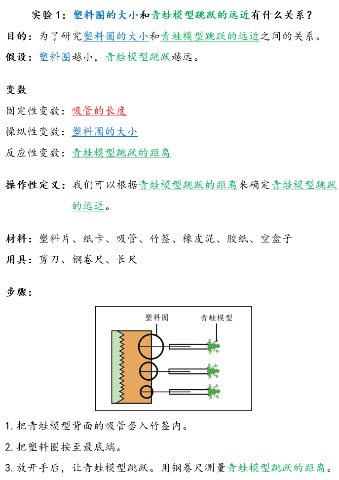 实验1:塑料圈的大小和青蛙模型跳跃的远近有什么关系?【课本第2页】